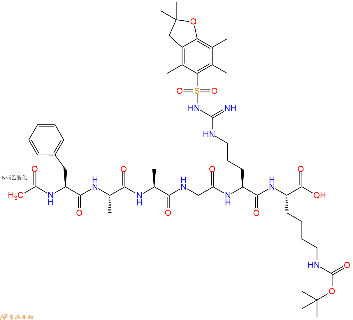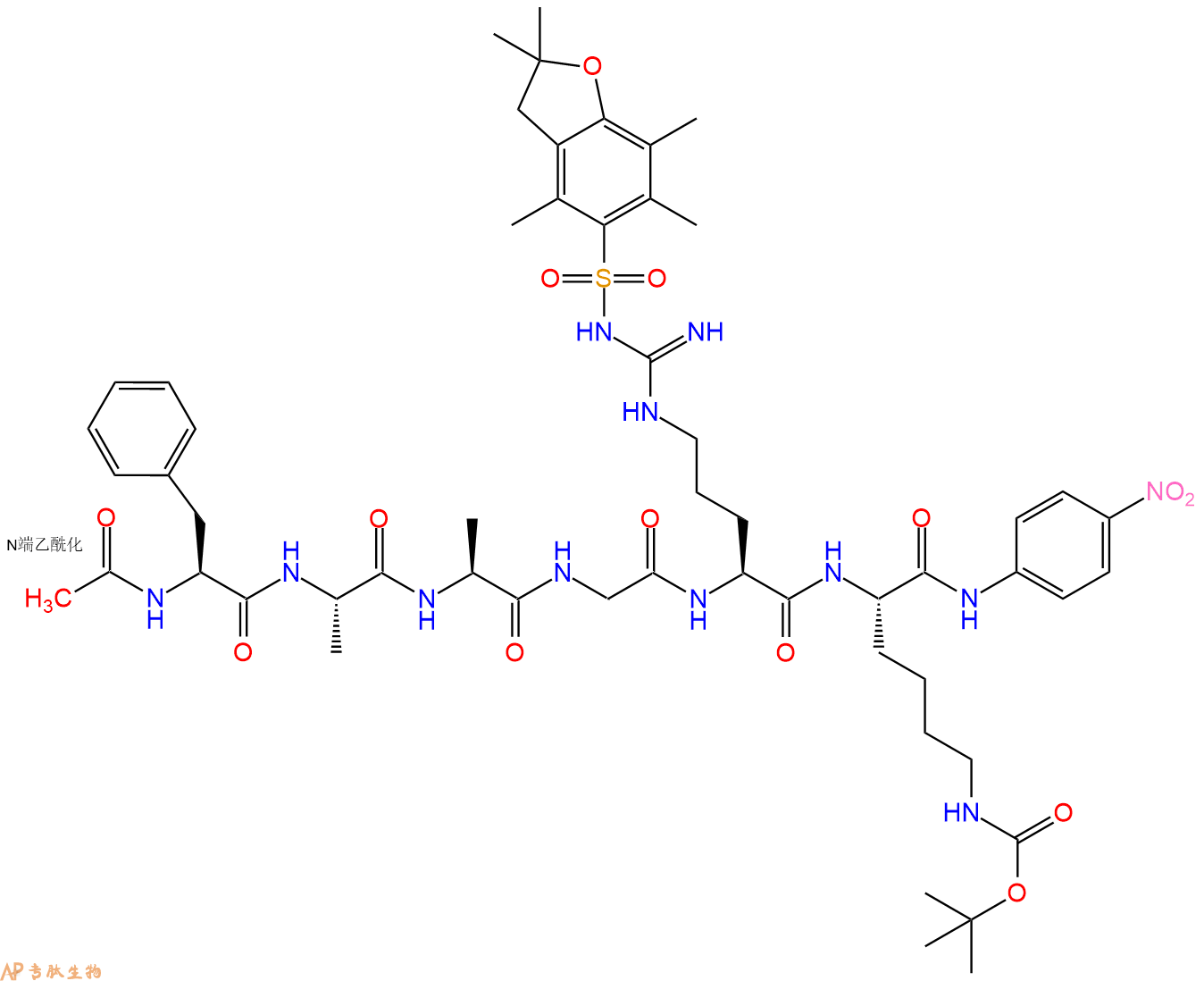 | 三字母: | Ac N端乙酰化封端,一种常见的修饰方式,常用于模拟蛋白质中的肽片段。 -PheL-苯丙氨酸:phenylalanine。系统命名为(2S)-氨基-3-苯基丙酸。是编码氨基酸。是哺乳动物的必需氨基酸。符号:F,Phe。 -Ala丙氨酸:alanine。L-丙氨酸的系统命名为(2S)-氨基丙酸,是编码氨基酸,也叫L-α-丙氨酸。符号:A,Ala。D-丙氨酸存在于多种细菌细胞壁的糖肽中。β-丙氨酸是维生素泛酸和辅酶A的组分。 -Ala丙氨酸:alanine。L-丙氨酸的系统命名为(2S)-氨基丙酸,是编码氨基酸,也叫L-α-丙氨酸。符号:A,Ala。D-丙氨酸存在于多种细菌细胞壁的糖肽中。β-丙氨酸是维生素泛酸和辅酶A的组分。 -Gly甘氨酸:glycine。系统命名为 2-氨基乙酸。是编码氨基酸中没有旋光性的最简单的氨基酸,因具有甜味而得名。符号:G,Gly。 -ArgL-精氨酸:arginine。系统命名为(2S)-氨基-5-胍基戊酸。在生理条件下带正电荷,为编码氨基酸。是幼小哺乳动物的必需氨基酸。符号:R,Arg。 -LysL-赖氨酸:lysine。系统命名为(2S)-6-二氨基已酸。是编码氨基酸中的碱性氨基酸,哺乳动物的必需氨基酸。在蛋白质中的赖氨酸可以被修饰为多种形式的衍生物。符号:K,Lys。 -pNA对硝基苯胺 |