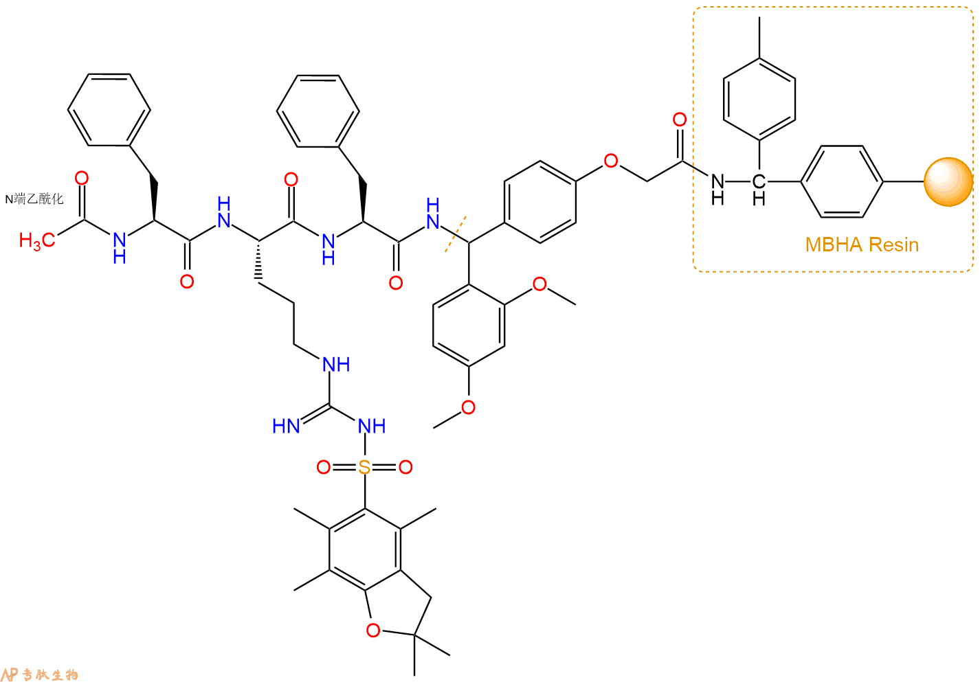 5、乙酸酐反应连接:在上述树脂中,加入适当DMF后,再加入1.4mmol乙酸酐到树脂中,再加入2.81mmol DIPEA,鼓氮气反应30分钟。用2倍树脂体积的DMF 洗涤3次树脂(洗涤树脂,去掉残留溶剂,为下一步反应做准备)。 得到Ac-Phe-Arg(Pbf)-Phe-Linker-MBHAResin。 结构如下: