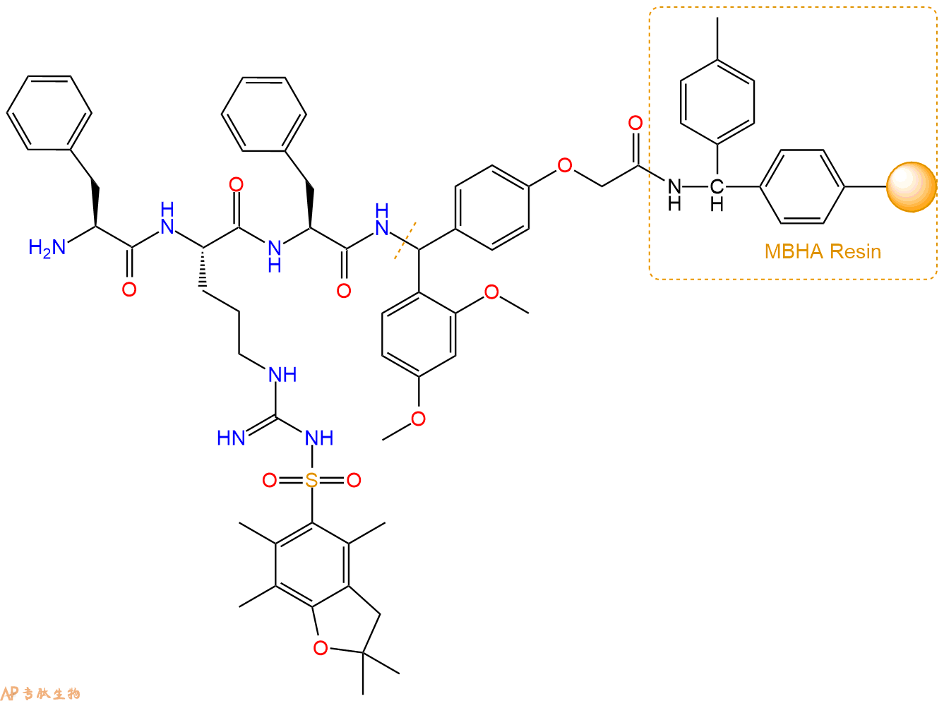 最后再经过步骤二得到 H2N-Phe-Arg(Pbf)-Phe-Linker-MBHA Resin,结构如下: