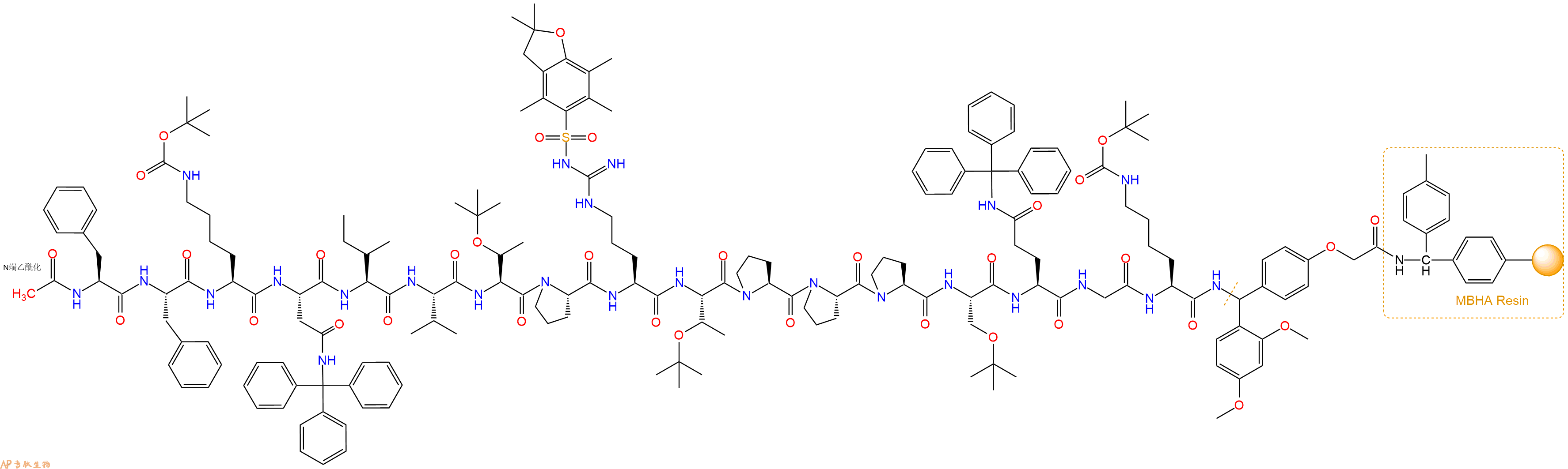5、乙酸酐反应连接:在上述树脂中,加入适当DMF后,再加入1.3mmol乙酸酐到树脂中,再加入2.61mmol DIPEA,鼓氮气反应30分钟。用2倍树脂体积的DMF 洗涤3次树脂(洗涤树脂,去掉残留溶剂,为下一步反应做准备)。 得到Ac-Phe-Phe-Lys(Boc)-Asn(Trt)-Ile-Val-Thr(tBu)-Pro-Arg(Pbf)-Thr(tBu)-Pro-Pro-Pro-Ser(tBu)-Gln(Trt)-Gly-Lys(Boc)-Linker-MBHAResin。 结构如下: