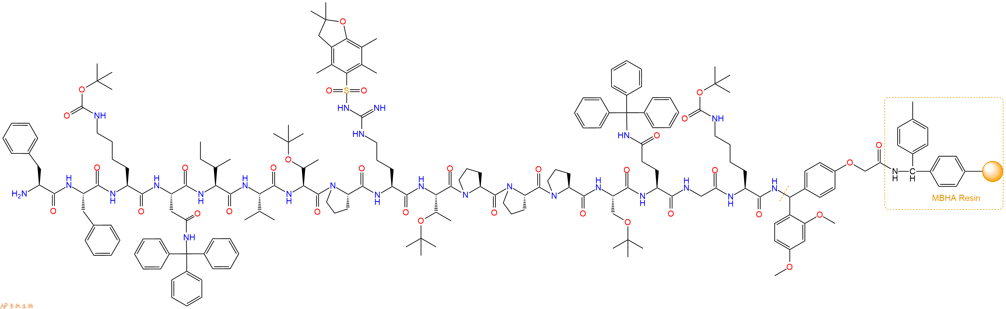 H2N-Phe-Lys(Boc)-Asn(Trt)-Ile-Val-Thr(tBu)-Pro-Arg(Pbf)-Thr(tBu)-Pro-Pro-Pro-Ser(tBu)-Gln(Trt)-Gly-Lys(Boc)-Linker-MBHA Resin