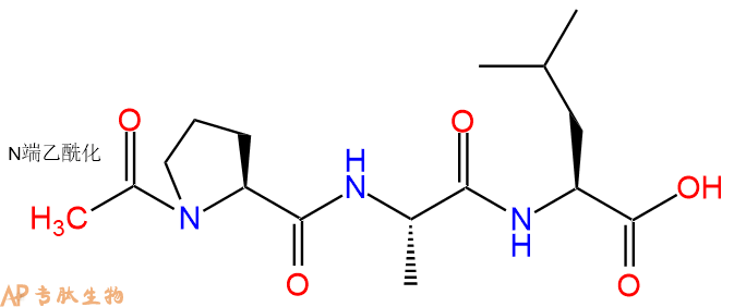 | 三字母: | Ac N端乙酰化封端,一种常见的修饰方式,常用于模拟蛋白质中的肽片段。 -ProL-脯氨酸:proline。系统命名为吡咯烷-(2S)-羧酸。为亚氨基酸。是编码氨基酸。在肽链中有特殊作用,如易形成顺式的肽键等。符号:P,Pro。 -Ala丙氨酸:alanine。L-丙氨酸的系统命名为(2S)-氨基丙酸,是编码氨基酸,也叫L-α-丙氨酸。符号:A,Ala。D-丙氨酸存在于多种细菌细胞壁的糖肽中。β-丙氨酸是维生素泛酸和辅酶A的组分。 -LeuL-亮氨酸:leucine。系统命名为(2S)-氨基-4-甲基戊酸。是编码氨基酸。是哺乳动物的必需氨基酸。符号:L,Leu。 -AMC7-氨基-4-甲基香豆素(AMC或Amc)是一种荧光染料,其激发波长为350纳米,发射波长为450纳米。 |