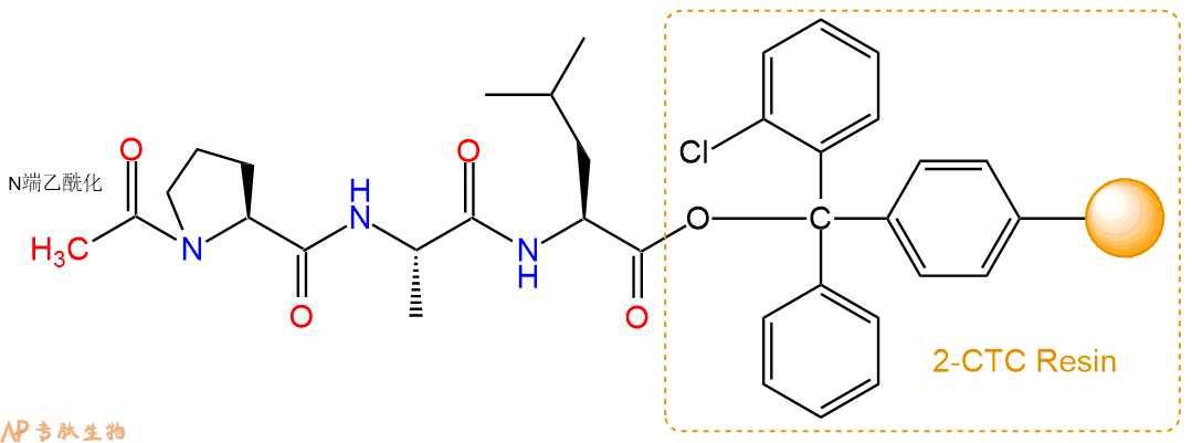 5、乙酸酐反应连接:在上述树脂中,加入适当DMF后,再加入1.34mmol 乙酸酐到树脂中,再加入2.68mmol DIPEA、1.27mmol HBTU,鼓氮气反应30分钟。用2倍树脂体积的DMF 洗涤3次树脂(洗涤树脂,去掉残留溶剂,为下一步反应做准备)。 得到Ac-Pro-Ala-Leu-CTC Resin。 结构如下: