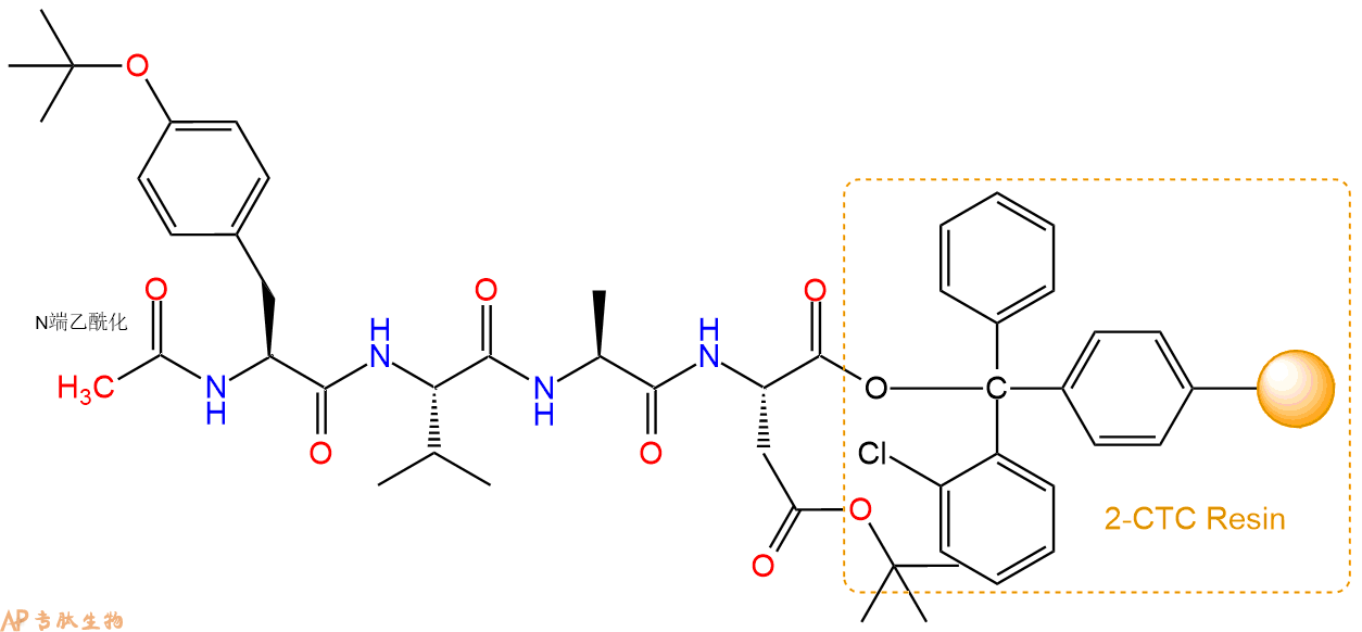 5、乙酸酐反应连接:在上述树脂中,加入适当DMF后,再加入0.54mmol 乙酸酐到树脂中,再加入1.09mmol DIPEA、0.52mmol HBTU,鼓氮气反应30分钟。用2倍树脂体积的DMF 洗涤3次树脂(洗涤树脂,去掉残留溶剂,为下一步反应做准备)。 得到Ac-Tyr(tBu)-Val-Ala-Asp(OtBu)-CTC Resin。 结构如下:
