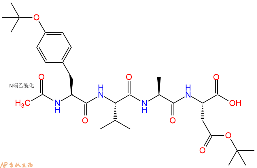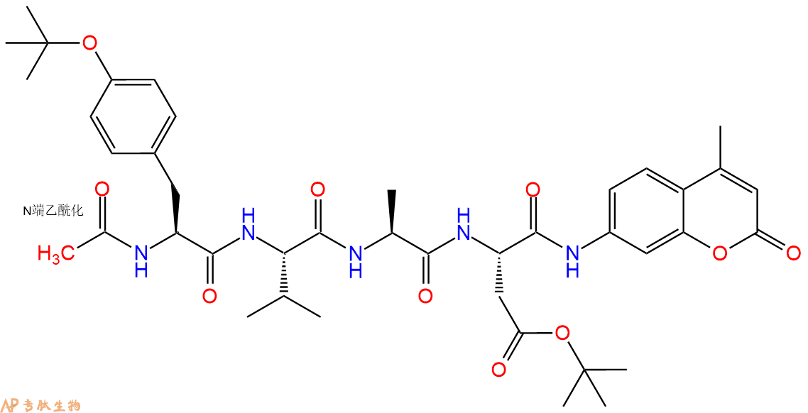 | 三字母: | Ac N端乙酰化封端,一种常见的修饰方式,常用于模拟蛋白质中的肽片段。 -TyrL-酪氨酸:tyrosine。系统命名为(2S)-氨基-3-(4-羟基苯基)丙酸。是编码氨基酸。符号:Y,Tyr。 -ValL-缬氨酸:valine。系统命名为(2S)-氨基-3-甲基丁酸。是编码氨基酸。是哺乳动物的必需氨基酸。符号:V,Val。在某些放线菌素如缬霉素中存在 D-缬氨酸。 -Ala丙氨酸:alanine。L-丙氨酸的系统命名为(2S)-氨基丙酸,是编码氨基酸,也叫L-α-丙氨酸。符号:A,Ala。D-丙氨酸存在于多种细菌细胞壁的糖肽中。β-丙氨酸是维生素泛酸和辅酶A的组分。 -AspL-天冬氨酸:aspartic acid。系统命名为(2S)-氨基-丁二酸。是编码氨基酸,又是神经递质。符号:D,Asp。D-天冬氨酸存在于多种细菌的细胞壁和短杆菌肽A中。 -AMC7-氨基-4-甲基香豆素(AMC或Amc)是一种荧光染料,其激发波长为350纳米,发射波长为450纳米。 |