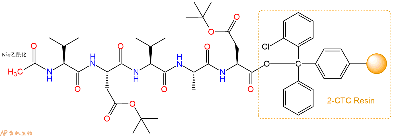 5、乙酸酐反应连接:在上述树脂中,加入适当DMF后,再加入1.71mmol 乙酸酐到树脂中,再加入3.41mmol DIPEA、1.62mmol HBTU,鼓氮气反应30分钟。用2倍树脂体积的DMF 洗涤3次树脂(洗涤树脂,去掉残留溶剂,为下一步反应做准备)。 得到Ac-Val-Asp(OtBu)-Val-Ala-Asp(OtBu)-CTC Resin。 结构如下: