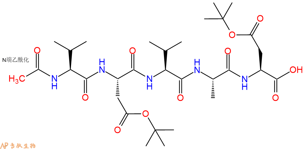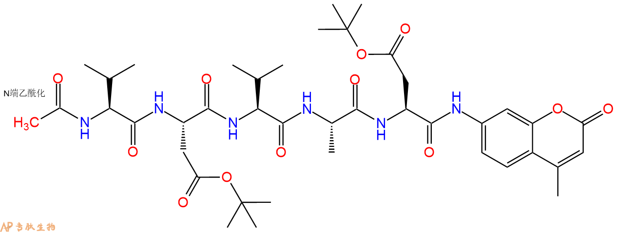 三字母: | Ac N端乙酰化封端,一种常见的修饰方式,常用于模拟蛋白质中的肽片段。 -ValL-缬氨酸:valine。系统命名为(2S)-氨基-3-甲基丁酸。是编码氨基酸。是哺乳动物的必需氨基酸。符号:V,Val。在某些放线菌素如缬霉素中存在 D-缬氨酸。 -AspL-天冬氨酸:aspartic acid。系统命名为(2S)-氨基-丁二酸。是编码氨基酸,又是神经递质。符号:D,Asp。D-天冬氨酸存在于多种细菌的细胞壁和短杆菌肽A中。 -ValL-缬氨酸:valine。系统命名为(2S)-氨基-3-甲基丁酸。是编码氨基酸。是哺乳动物的必需氨基酸。符号:V,Val。在某些放线菌素如缬霉素中存在 D-缬氨酸。 -Ala丙氨酸:alanine。L-丙氨酸的系统命名为(2S)-氨基丙酸,是编码氨基酸,也叫L-α-丙氨酸。符号:A,Ala。D-丙氨酸存在于多种细菌细胞壁的糖肽中。β-丙氨酸是维生素泛酸和辅酶A的组分。 -AspL-天冬氨酸:aspartic acid。系统命名为(2S)-氨基-丁二酸。是编码氨基酸,又是神经递质。符号:D,Asp。D-天冬氨酸存在于多种细菌的细胞壁和短杆菌肽A中。 -AMC7-氨基-4-甲基香豆素(AMC或Amc)是一种荧光染料,其激发波长为350纳米,发射波长为450纳米。 |