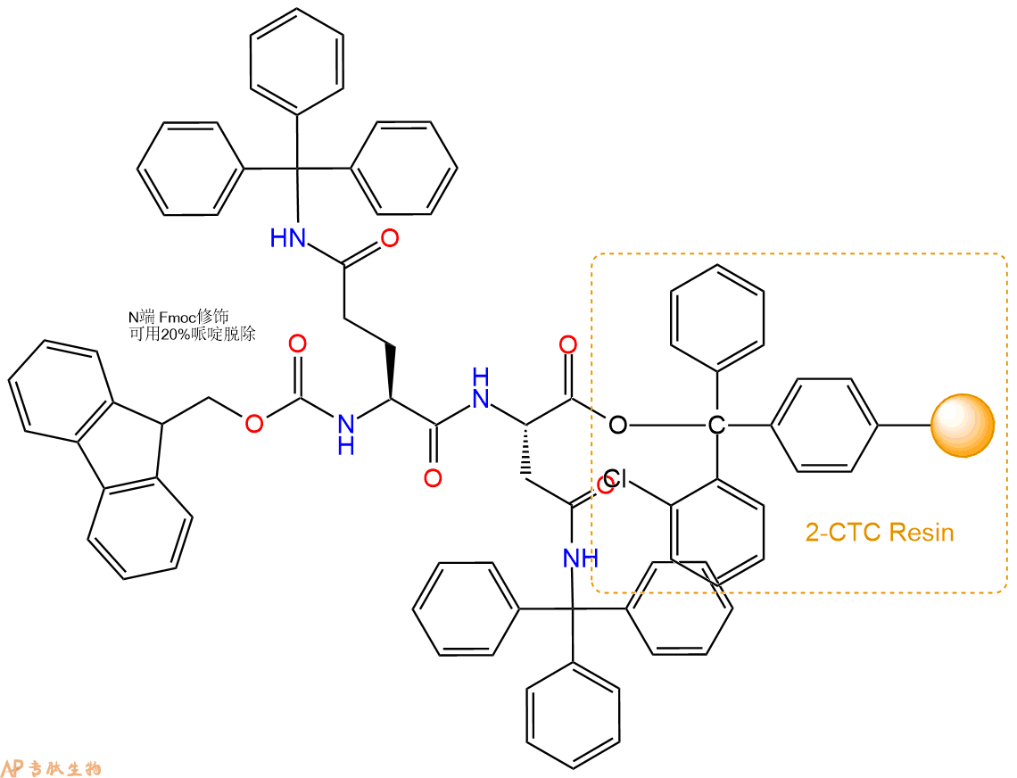 1、合成CTC树脂:称取0.43g CTC Resin(如初始取代度约为0.73mmol/g)和0.38mmol Fmoc-Asn(Trt)-OH于反应器中,加入适量DCM溶解氨基酸(需要注意,此时CTC树脂体积会增大好几倍,避免DCM溶液过少),再加入0.94mmol DIPEA(Mw:129.1,d:0.740g/ml),反应2-3小时后,可不抽滤溶液,直接加入1ml的HPLC级甲醇,封端半小时。依次用DMF洗涤2次,甲醇洗涤1次,DCM洗涤一次,甲醇洗涤一次,DCM洗涤一次,DMF洗涤2次(这里使用甲醇和DCM交替洗涤,是为了更好地去除其他溶质,有利于后续反应)。得到 Fmoc-Asn(Trt)-CTC Resin。结构图如下: