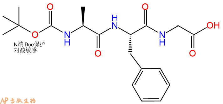 6、全保护切割:配置0.5%TFA/DCM溶液,溶液体积约为树脂体积的3倍。再次用DCM洗涤树脂2遍(去除残留DMF),后将配置好的溶液倒入到反应器中,反应30分钟。抽滤树脂,收集滤液(此时多肽已经从树脂上分离,存在于滤液中)。多肽序列为 Boc-Ala-Phe-Gly-CTC Resin。 在滤液中添加DIEPA,调PH至7-8。用饱和NaHCO3洗涤滤液,分离出DCM层溶液。可适当旋蒸DCM层溶液,减少有机溶剂。再次加入1或2倍体积的乙酸乙酯,用稀HCl溶液调PH至微酸性,将多肽从DCM层萃取到乙酸乙酯层。用饱和NaCl洗涤2次乙酸乙酯层。用无水硫酸镁吸收乙酸乙酯层的水分。通过减压旋蒸,直接将乙酸乙酯完全旋蒸掉,得到晶体状固体多肽,用于下一步C端反应。或通过减压旋蒸保留适量乙酸乙酯的溶液体积,加入冰乙醚析出 多肽,然后对多肽进行烘干操作即可用于下一步C端反应。Boc-Ala-Phe-Gly-COOH的结构图如下。