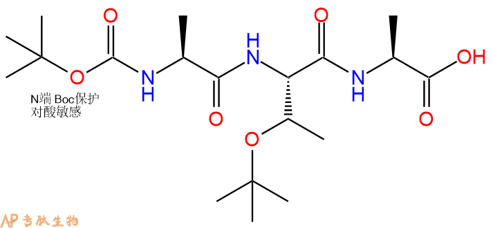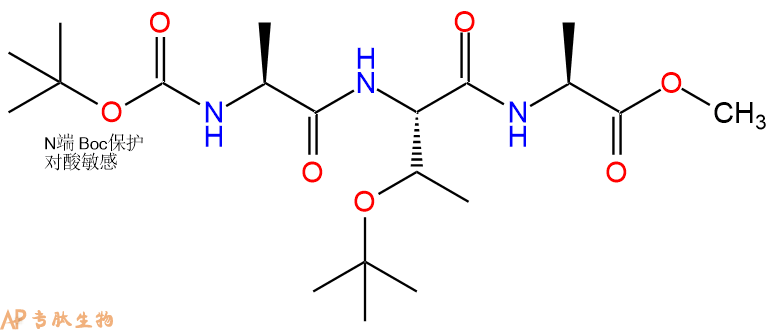 | 三字母: | H2N N端氨基:N-terminal amino group。在肽或多肽链中含有游离a-氨基的氨基酸一端。在表示氨基酸序列时,通常将N端放在肽链的左边。 -Ala丙氨酸:alanine。L-丙氨酸的系统命名为(2S)-氨基丙酸,是编码氨基酸,也叫L-α-丙氨酸。符号:A,Ala。D-丙氨酸存在于多种细菌细胞壁的糖肽中。β-丙氨酸是维生素泛酸和辅酶A的组分。 -ThrL-苏氨酸:threonine。系统命名为(2S)-氨基-(3R)-羟基丁酸。有两个手性中心,是编码氨基酸。是哺乳动物的必需氨基酸。符号:T,Thr。 -Ala丙氨酸:alanine。L-丙氨酸的系统命名为(2S)-氨基丙酸,是编码氨基酸,也叫L-α-丙氨酸。符号:A,Ala。D-丙氨酸存在于多种细菌细胞壁的糖肽中。β-丙氨酸是维生素泛酸和辅酶A的组分。 -OMeC端甲酯化修饰,甲酯是最简单的酯类,在溶液合成中作为重要的半永久性C端保护基团。它们可以转化为肽肼,而肽肼是反应性肽叠氮化物的先驱体。叠氮偶联仍是肽溶液合成中片段偶联最常用的方法。 |