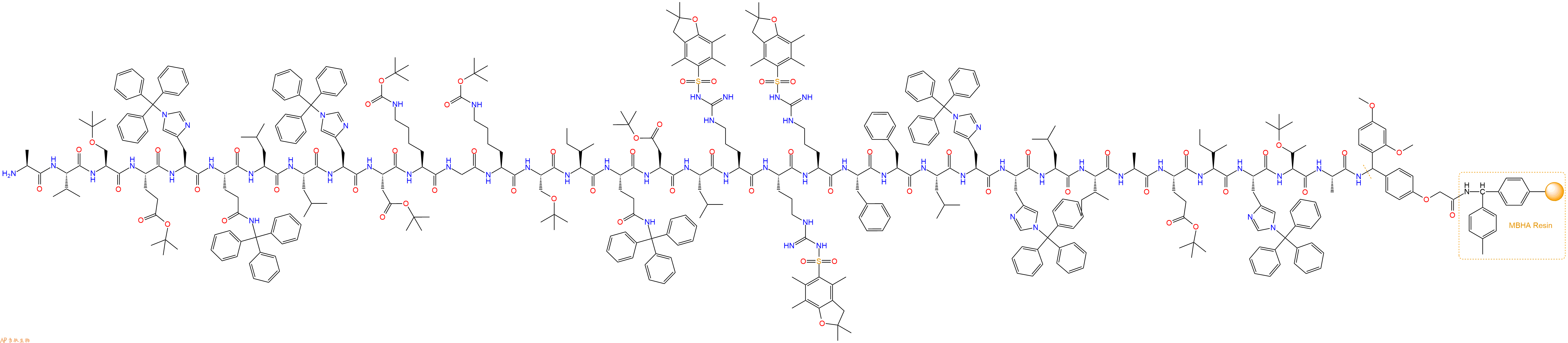 Fmoc-Ala-Val-Ser(tBu)-Glu(OtBu)-His(Trt)-Gln(Trt)-Leu-Leu-His(Trt)-Asp(OtBu)-Lys(Boc)-Gly-Lys(Boc)-Ser(tBu)-Ile-Gln(Trt)-Asp(OtBu)-Leu-Arg(Pbf)-Arg(Pbf)-Arg(Pbf)-Phe-Phe-Leu-His(Trt)-His(Trt)-Leu-Ile-Ala-Glu(OtBu)-Ile-His(Trt)-Thr(tBu)-Ala-Linker-MBHA Resin