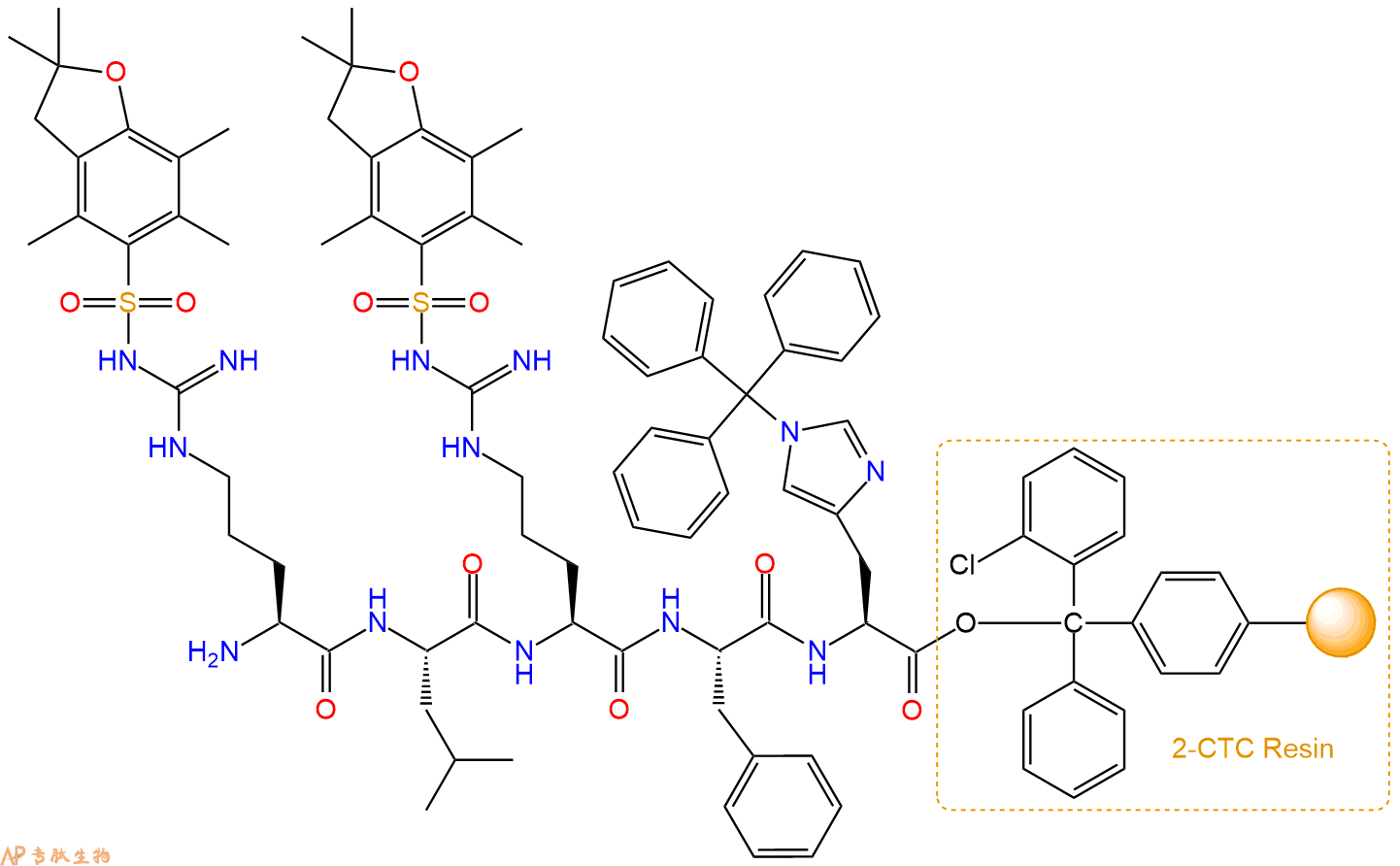 最后再经过步骤二得到 H2N-Arg(Pbf)-Leu-Arg(Pbf)-Phe-His(Trt)-CTC Resin,结构如下: