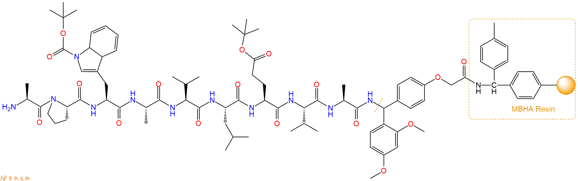 最后再经过步骤二得到 H2N-Ala-Pro-Trp(Boc)-Ala-Val-Leu-Glu(OtBu)-Val-Ala-Linker-MBHA Resin,结构如下: