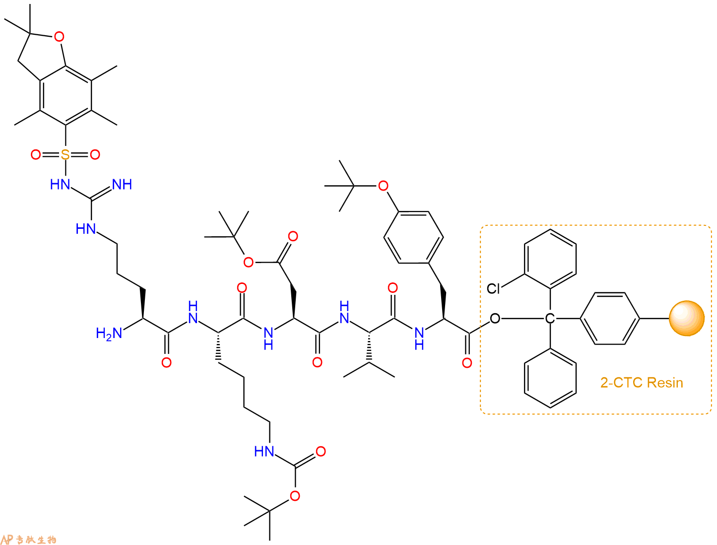 最后再经过步骤二得到 H2N-Arg(Pbf)-Lys(Boc)-Asp(OtBu)-Val-Tyr(tBu)-CTC Resin,结构如下: