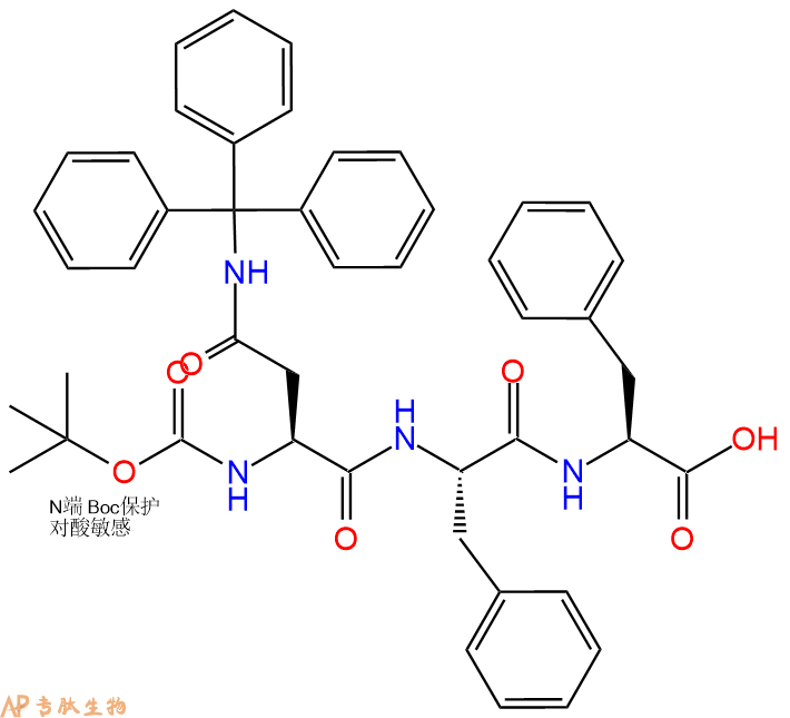6、全保护切割:配置0.5%TFA/DCM溶液,溶液体积约为树脂体积的3倍。再次用DCM洗涤树脂2遍(去除残留DMF),后将配置好的溶液倒入到反应器中,反应30分钟。抽滤树脂,收集滤液(此时多肽已经从树脂上分离,存在于滤液中)。多肽序列为 Boc-Asn(Trt)-Phe-Phe-CTC Resin。 在滤液中添加DIEPA,调PH至7-8。用饱和NaHCO3洗涤滤液,分离出DCM层溶液。可适当旋蒸DCM层溶液,减少有机溶剂。再次加入1或2倍体积的乙酸乙酯,用稀HCl溶液调PH至微酸性,将多肽从DCM层萃取到乙酸乙酯层。用饱和NaCl洗涤2次乙酸乙酯层。用无水硫酸镁吸收乙酸乙酯层的水分。通过减压旋蒸,直接将乙酸乙酯完全旋蒸掉,得到晶体状固体多肽,用于下一步C端反应。或通过减压旋蒸保留适量乙酸乙酯的溶液体积,加入冰乙醚析出 多肽,然后对多肽进行烘干操作即可用于下一步C端反应。Boc-Asn(Trt)-Phe-Phe-COOH的结构图如下。