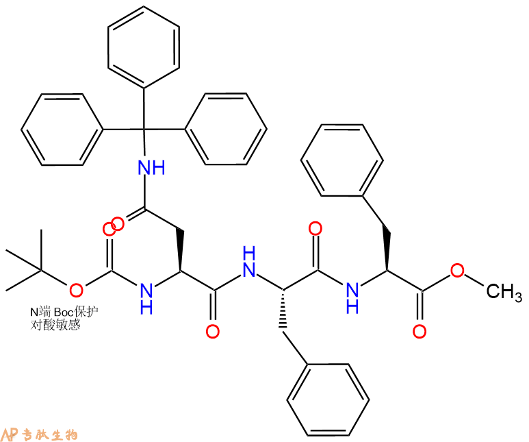 | 三字母: | H2N N端氨基:N-terminal amino group。在肽或多肽链中含有游离a-氨基的氨基酸一端。在表示氨基酸序列时,通常将N端放在肽链的左边。 -Asn天冬酰胺:asparagine。L-天冬酰胺的系统命名为(2S)-氨基-3-氨酰基丙酸,是编码氨基酸。符号:N,Asn。D-天冬酰胺存在于短杆菌肽A分子中。 -PheL-苯丙氨酸:phenylalanine。系统命名为(2S)-氨基-3-苯基丙酸。是编码氨基酸。是哺乳动物的必需氨基酸。符号:F,Phe。 -PheL-苯丙氨酸:phenylalanine。系统命名为(2S)-氨基-3-苯基丙酸。是编码氨基酸。是哺乳动物的必需氨基酸。符号:F,Phe。 -OMeC端甲酯化修饰,甲酯是最简单的酯类,在溶液合成中作为重要的半永久性C端保护基团。它们可以转化为肽肼,而肽肼是反应性肽叠氮化物的先驱体。叠氮偶联仍是肽溶液合成中片段偶联最常用的方法。 |