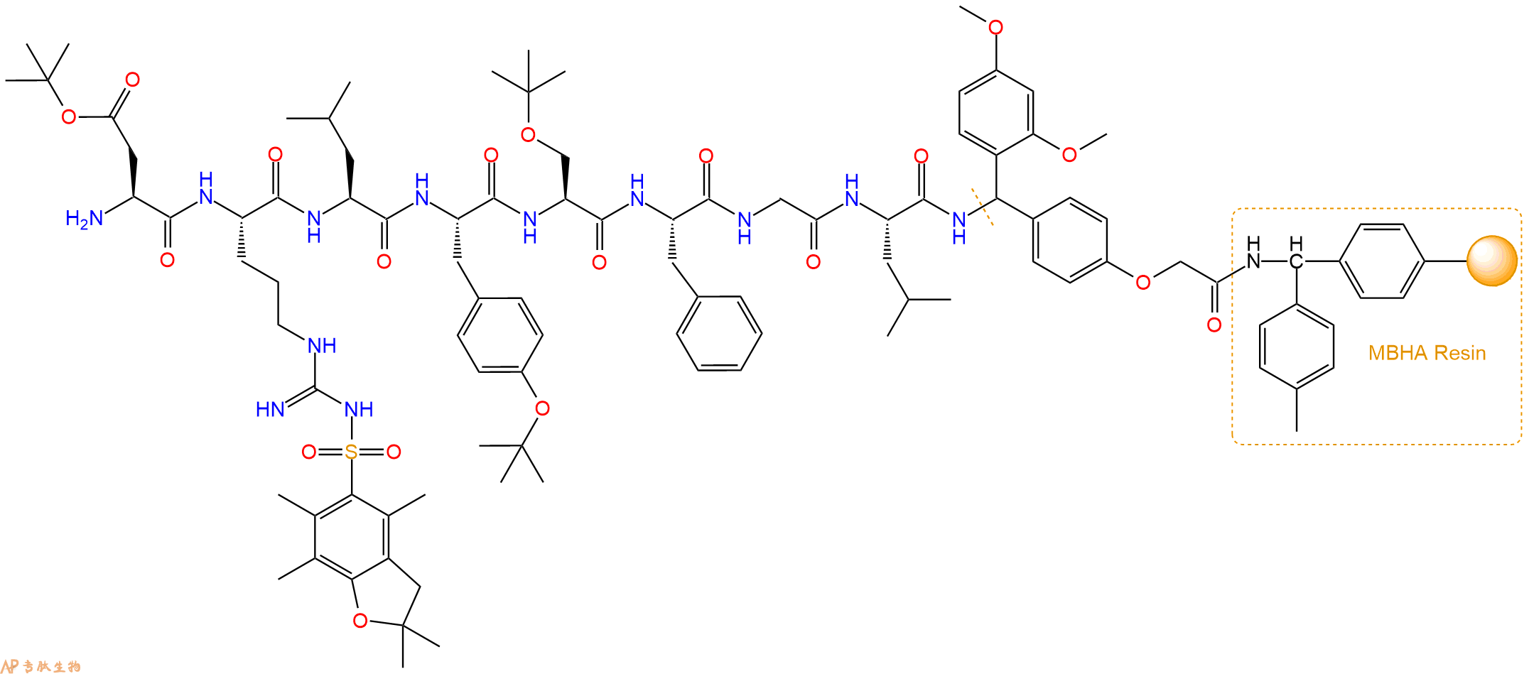 最后再经过步骤二得到 H2N-Asp(OtBu)-Arg(Pbf)-Leu-Tyr(tBu)-Ser(tBu)-Phe-Gly-Leu-Linker-MBHA Resin,结构如下: