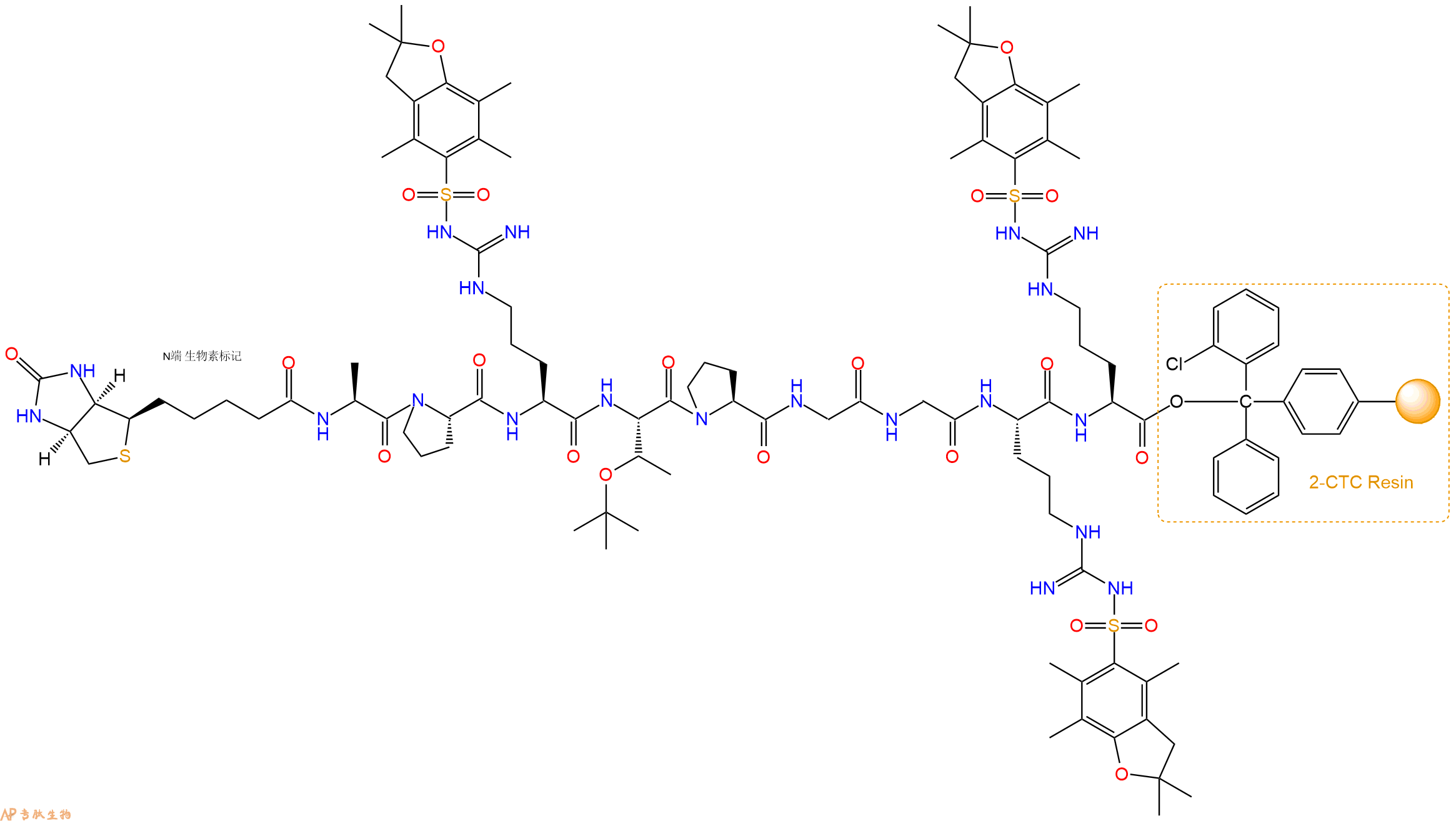 5、生物素反应连接:在上述树脂中,加入适当DMF后,再加入5.76mmol 生物素到树脂中,再加入11.52mmol DIPEA、5.47mmol HBTU,鼓氮气反应30分钟。用2倍树脂体积的DMF 洗涤3次树脂(洗涤树脂,去掉残留溶剂,为下一步反应做准备)。 得到Biotin-Ala-Pro-Arg(Pbf)-Thr(tBu)-Pro-Gly-Gly-Arg(Pbf)-Arg(Pbf)-CTCResin。 结构如下: