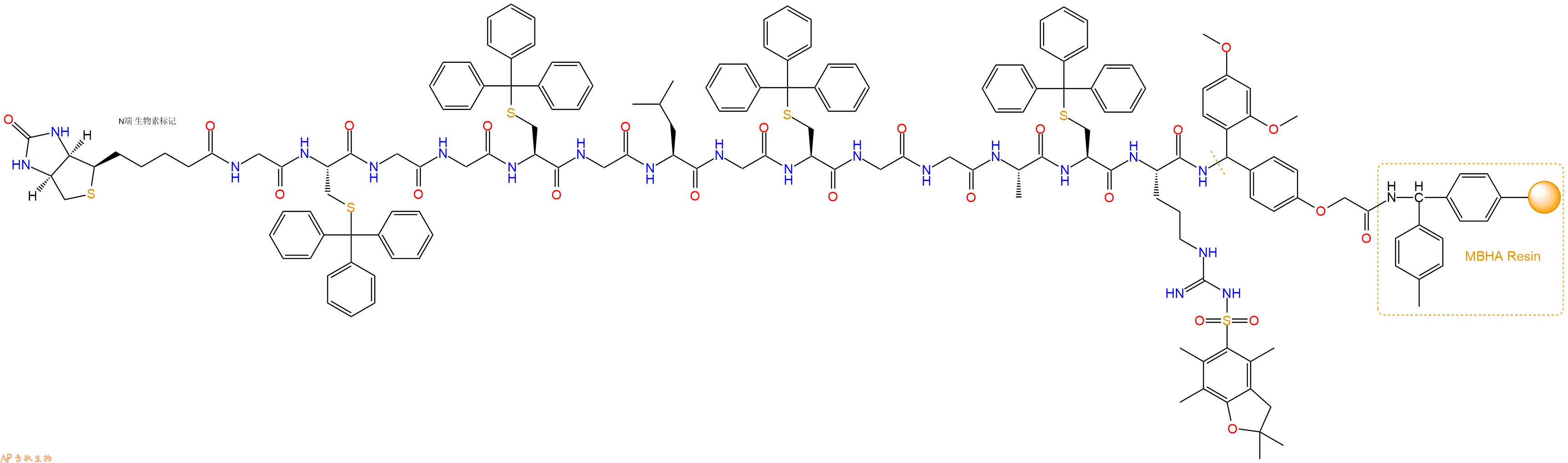 5、生物素反应连接:在上述树脂中,加入适当DMF后,再加入1.52mmol 生物素到树脂中,再加入3.04mmol DIPEA、1.44mmol HBTU,鼓氮气反应30分钟。用2倍树脂体积的DMF 洗涤3次树脂(洗涤树脂,去掉残留溶剂,为下一步反应做准备)。 得到Biotin-Gly-Cys(Trt)-Gly-Gly-Cys(Trt)-Gly-Leu-Gly-Cys(Trt)-Gly-Gly-Ala-Cys(Trt)-Arg(Pbf)-Linker-MBHAResin。 结构如下: