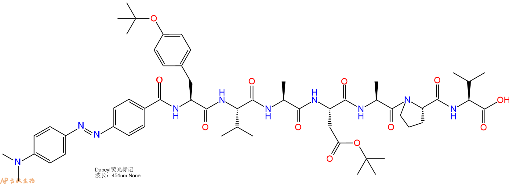 6、全保护切割:配置0.5%TFA/DCM溶液,溶液体积约为树脂体积的3倍。再次用DCM洗涤树脂2遍(去除残留DMF),后将配置好的溶液倒入到反应器中,反应30分钟。抽滤树脂,收集滤液(此时多肽已经从树脂上分离,存在于滤液中)。多肽序列为 DABCYL-Tyr(tBu)-Val-Ala-Asp(OtBu)-Ala-Pro-Val-CTC Resin。 在滤液中添加DIEPA,调PH至7-8。用饱和NaHCO3洗涤滤液,分离出DCM层溶液。可适当旋蒸DCM层溶液,减少有机溶剂。再次加入1或2倍体积的乙酸乙酯,用稀HCl溶液调PH至微酸性,将多肽从DCM层萃取到乙酸乙酯层。用饱和NaCl洗涤2次乙酸乙酯层。用无水硫酸镁吸收乙酸乙酯层的水分。通过减压旋蒸,直接将乙酸乙酯完全旋蒸掉,得到晶体状固体多肽,用于下一步C端反应。或通过减压旋蒸保留适量乙酸乙酯的溶液体积,加入冰乙醚析出 多肽,然后对多肽进行烘干操作即可用于下一步C端反应。DABCYL-Tyr(tBu)-Val-Ala-Asp(OtBu)-Ala-Pro-Val-COOH的结构图如下。