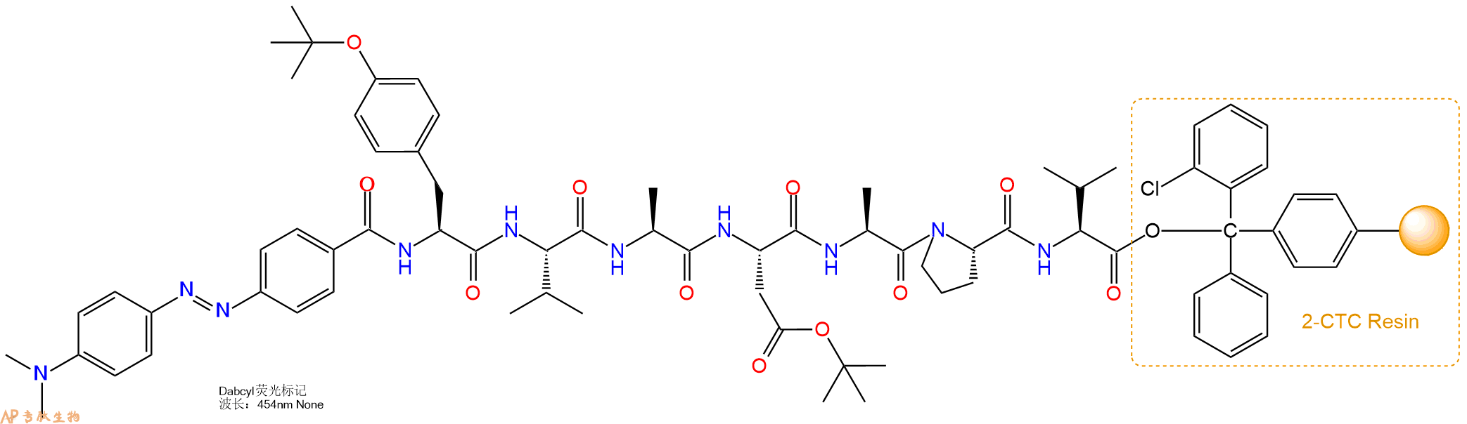 5、4-二甲胺偶氮苯-4’-羧酸(DABCYL)反应连接:在上述树脂中,加入适当DMF后,再加入4.91mmol4-二甲胺偶氮苯-4’-羧酸(DABCYL)到树脂中,再加入9.82mmol DIPEA,鼓氮气反应30分钟。用2倍树脂体积的DMF 洗涤3次树脂(洗涤树脂,去掉残留溶剂,为下一步反应做准备)。 得到DABCYL-Tyr(tBu)-Val-Ala-Asp(OtBu)-Ala-Pro-Val-CTC Resin。 结构如下: