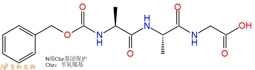 6、全保护切割:配置0.5%TFA/DCM溶液,溶液体积约为树脂体积的3倍。再次用DCM洗涤树脂2遍(去除残留DMF),后将配置好的溶液倒入到反应器中,反应30分钟。抽滤树脂,收集滤液(此时多肽已经从树脂上分离,存在于滤液中)。多肽序列为 Cbz-Ala-Ala-Gly-CTC Resin。 在滤液中添加DIEPA,调PH至7-8。用饱和NaHCO3洗涤滤液,分离出DCM层溶液。可适当旋蒸DCM层溶液,减少有机溶剂。再次加入1或2倍体积的乙酸乙酯,用稀HCl溶液调PH至微酸性,将多肽从DCM层萃取到乙酸乙酯层。用饱和NaCl洗涤2次乙酸乙酯层。用无水硫酸镁吸收乙酸乙酯层的水分。通过减压旋蒸,直接将乙酸乙酯完全旋蒸掉,得到晶体状固体多肽,用于下一步C端反应。或通过减压旋蒸保留适量乙酸乙酯的溶液体积,加入冰乙醚析出 多肽,然后对多肽进行烘干操作即可用于下一步C端反应。Cbz-Ala-Ala-Gly-COOH的结构图如下。