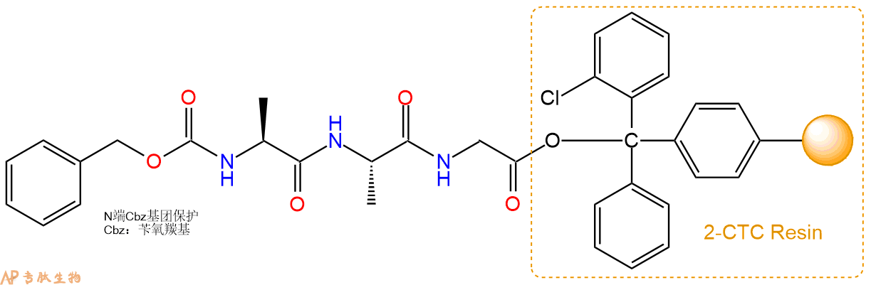 5、苯甲氧羰酰琥珀酰亚胺Cbz-Cl反应连接:在上述树脂中,加入适当DMF后,再加入7.62mmol 苯甲氧羰酰琥珀酰亚胺Cbz-Cl到树脂中,再加入15.25mmol DIPEA、7.24mmol HBTU,鼓氮气反应30分钟。用2倍树脂体积的DMF 洗涤3次树脂(洗涤树脂,去掉残留溶剂,为下一步反应做准备)。 得到Cbz-Ala-Ala-Gly-CTC Resin。 结构如下: