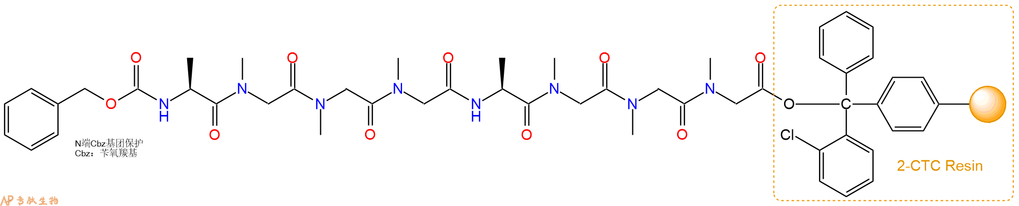 5、苯甲氧羰酰琥珀酰亚胺Cbz-Cl反应连接:在上述树脂中,加入适当DMF后,再加入2.59mmol 苯甲氧羰酰琥珀酰亚胺Cbz-Cl到树脂中,再加入5.18mmol DIPEA、2.46mmol HBTU,鼓氮气反应30分钟。用2倍树脂体积的DMF 洗涤3次树脂(洗涤树脂,去掉残留溶剂,为下一步反应做准备)。 得到Cbz-Ala-Sar-Sar-Sar-Ala-Sar-Sar-Sar-CTC Resin。 结构如下: