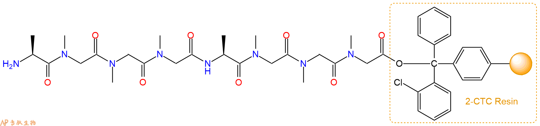 最后再经过步骤二得到 H2N-Ala-Sar-Sar-Sar-Ala-Sar-Sar-Sar-CTC Resin,结构如下:
