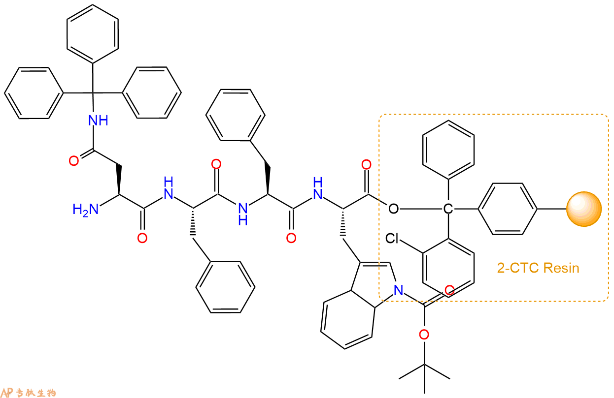 最后再经过步骤二得到 H2N-Asn(Trt)-Phe-Phe-Trp(Boc)-CTC Resin,结构如下: