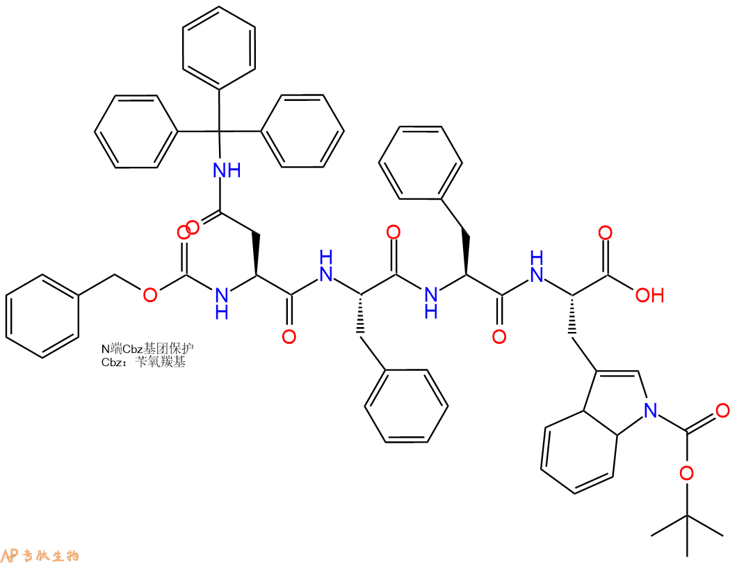 6、全保护切割:配置0.5%TFA/DCM溶液,溶液体积约为树脂体积的3倍。再次用DCM洗涤树脂2遍(去除残留DMF),后将配置好的溶液倒入到反应器中,反应30分钟。抽滤树脂,收集滤液(此时多肽已经从树脂上分离,存在于滤液中)。多肽序列为 Cbz-Asn(Trt)-Phe-Phe-Trp(Boc)-CTC Resin。 在滤液中添加DIEPA,调PH至7-8。用饱和NaHCO3洗涤滤液,分离出DCM层溶液。可适当旋蒸DCM层溶液,减少有机溶剂。再次加入1或2倍体积的乙酸乙酯,用稀HCl溶液调PH至微酸性,将多肽从DCM层萃取到乙酸乙酯层。用饱和NaCl洗涤2次乙酸乙酯层。用无水硫酸镁吸收乙酸乙酯层的水分。通过减压旋蒸,直接将乙酸乙酯完全旋蒸掉,得到晶体状固体多肽,用于下一步C端反应。或通过减压旋蒸保留适量乙酸乙酯的溶液体积,加入冰乙醚析出 多肽,然后对多肽进行烘干操作即可用于下一步C端反应。Cbz-Asn(Trt)-Phe-Phe-Trp(Boc)-COOH的结构图如下。