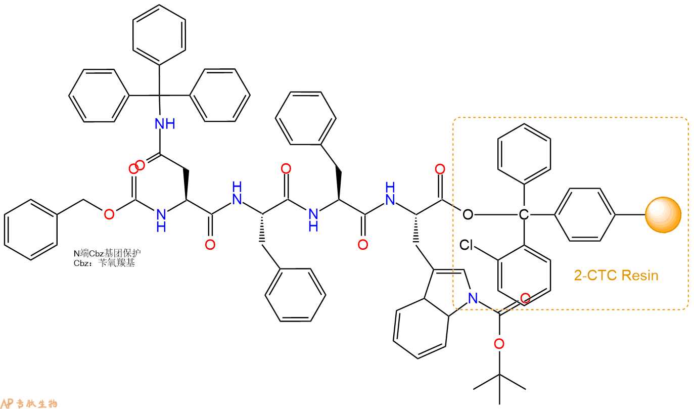 5、苯甲氧羰酰琥珀酰亚胺Cbz-Cl反应连接:在上述树脂中,加入适当DMF后,再加入4.79mmol 苯甲氧羰酰琥珀酰亚胺Cbz-Cl到树脂中,再加入9.57mmol DIPEA、4.55mmol HBTU,鼓氮气反应30分钟。用2倍树脂体积的DMF 洗涤3次树脂(洗涤树脂,去掉残留溶剂,为下一步反应做准备)。 得到Cbz-Asn(Trt)-Phe-Phe-Trp(Boc)-CTC Resin。 结构如下:
