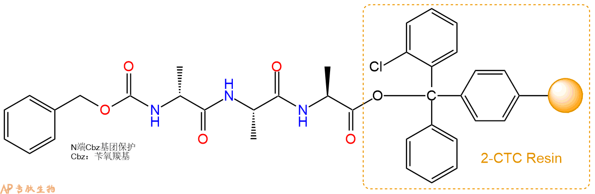 5、苯甲氧羰酰琥珀酰亚胺Cbz-Cl反应连接:在上述树脂中,加入适当DMF后,再加入6.2mmol 苯甲氧羰酰琥珀酰亚胺Cbz-Cl到树脂中,再加入12.41mmol DIPEA、5.89mmol HBTU,鼓氮气反应30分钟。用2倍树脂体积的DMF 洗涤3次树脂(洗涤树脂,去掉残留溶剂,为下一步反应做准备)。 得到Cbz-DAla-Ala-Ala-CTC Resin。 结构如下: