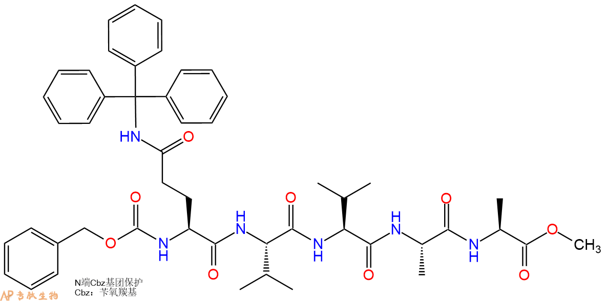 6、全保护切割:配置0.5%TFA/DCM溶液,溶液体积约为树脂体积的3倍。再次用DCM洗涤树脂2遍(去除残留DMF),后将配置好的溶液倒入到反应器中,反应30分钟。抽滤树脂,收集滤液(此时多肽已经从树脂上分离,存在于滤液中)。多肽序列为 Cbz-Gln(Trt)-Val-Val-Ala-Ala-CTC Resin。 在滤液中添加DIEPA,调PH至7-8。用饱和NaHCO3洗涤滤液,分离出DCM层溶液。可适当旋蒸DCM层溶液,减少有机溶剂。再次加入1或2倍体积的乙酸乙酯,用稀HCl溶液调PH至微酸性,将多肽从DCM层萃取到乙酸乙酯层。用饱和NaCl洗涤2次乙酸乙酯层。用无水硫酸镁吸收乙酸乙酯层的水分。通过减压旋蒸,直接将乙酸乙酯完全旋蒸掉,得到晶体状固体多肽,用于下一步C端反应。或通过减压旋蒸保留适量乙酸乙酯的溶液体积,加入冰乙醚析出 多肽,然后对多肽进行烘干操作即可用于下一步C端反应。Cbz-Gln(Trt)-Val-Val-Ala-Ala-COOH的结构图如下。