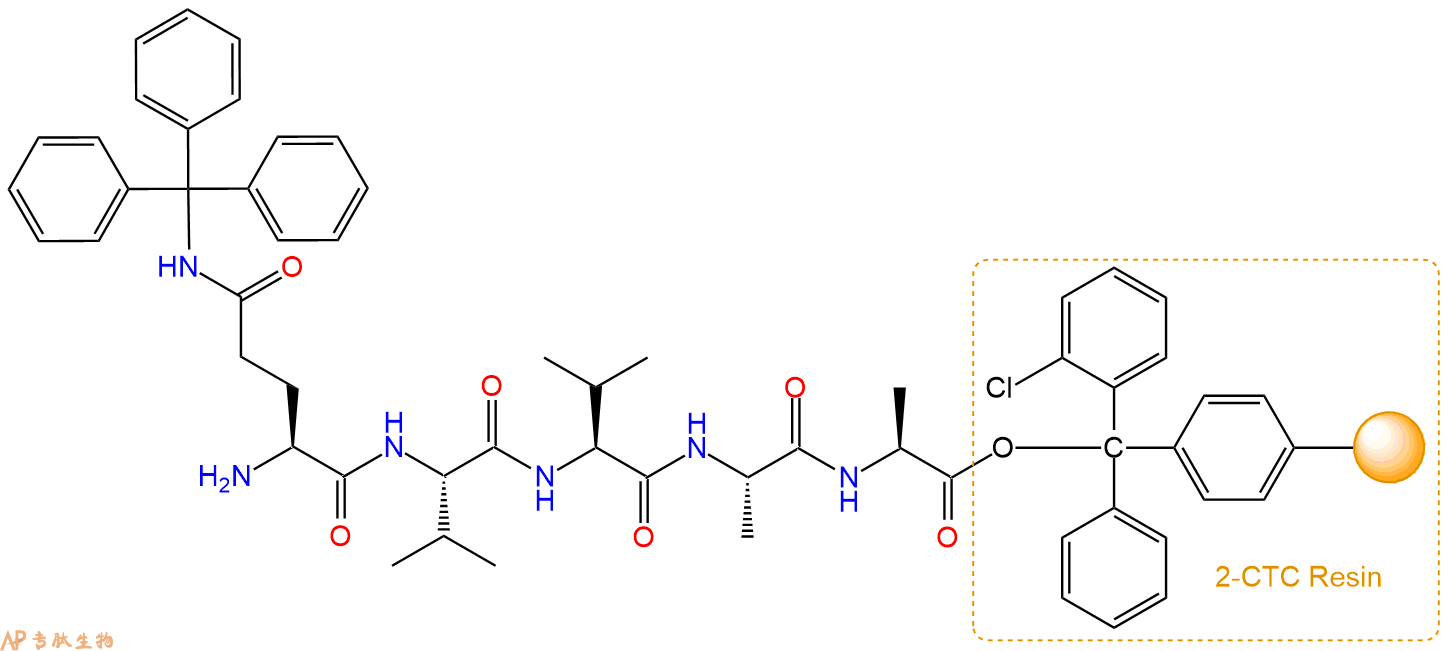 最后再经过步骤二得到 H2N-Gln(Trt)-Val-Val-Ala-Ala-CTC Resin,结构如下: