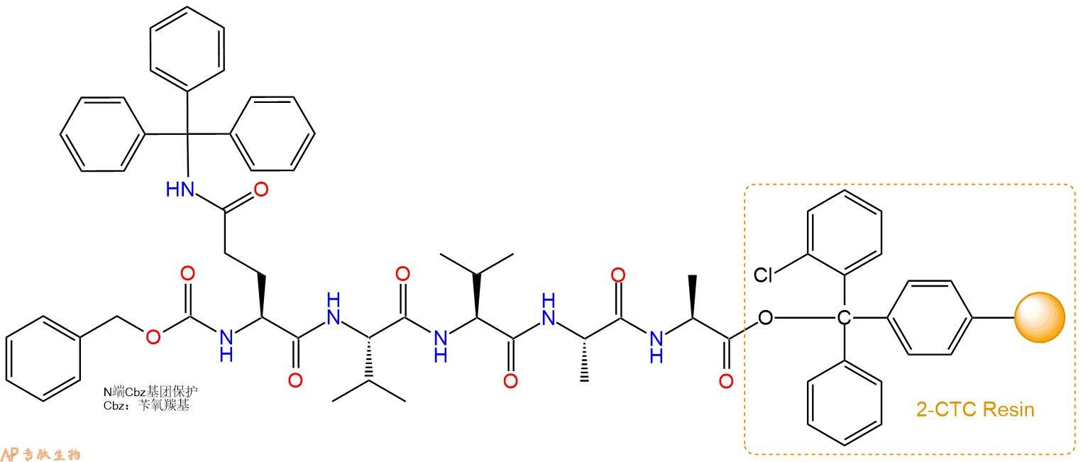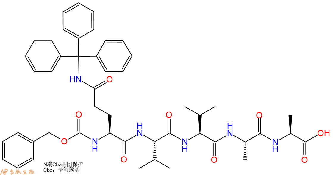 6、全保护切割:配置0.5%TFA/DCM溶液,溶液体积约为树脂体积的3倍。再次用DCM洗涤树脂2遍(去除残留DMF),后将配置好的溶液倒入到反应器中,反应30分钟。抽滤树脂,收集滤液(此时多肽已经从树脂上分离,存在于滤液中)。多肽序列为 Cbz-Gln(Trt)-Val-Val-Ala-Ala-CTC Resin。 在滤液中添加DIEPA,调PH至7-8。用饱和NaHCO3洗涤滤液,分离出DCM层溶液。可适当旋蒸DCM层溶液,减少有机溶剂。再次加入1或2倍体积的乙酸乙酯,用稀HCl溶液调PH至微酸性,将多肽从DCM层萃取到乙酸乙酯层。用饱和NaCl洗涤2次乙酸乙酯层。用无水硫酸镁吸收乙酸乙酯层的水分。通过减压旋蒸,直接将乙酸乙酯完全旋蒸掉,得到晶体状固体多肽,用于下一步C端反应。或通过减压旋蒸保留适量乙酸乙酯的溶液体积,加入冰乙醚析出 多肽,然后对多肽进行烘干操作即可用于下一步C端反应。Cbz-Gln(Trt)-Val-Val-Ala-Ala-COOH的结构图如下。