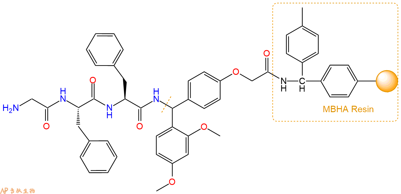最后再经过步骤二得到 H2N-Gly-Phe-Phe-Linker-MBHA Resin,结构如下: