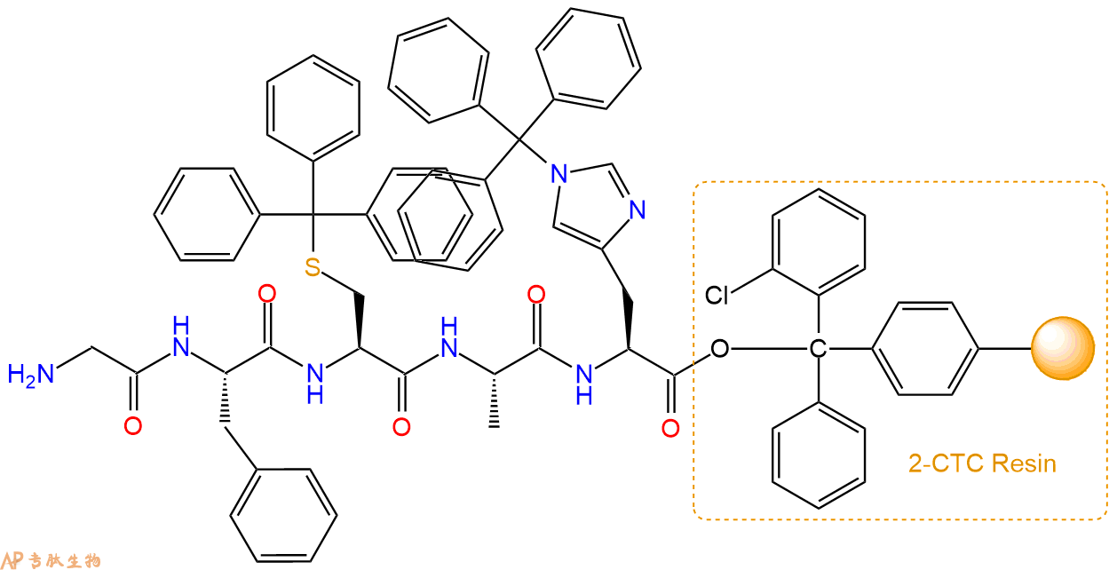 最后再经过步骤二得到 H2N-Gly-Phe-Cys(Trt)-Ala-His(Trt)-CTC Resin,结构如下: