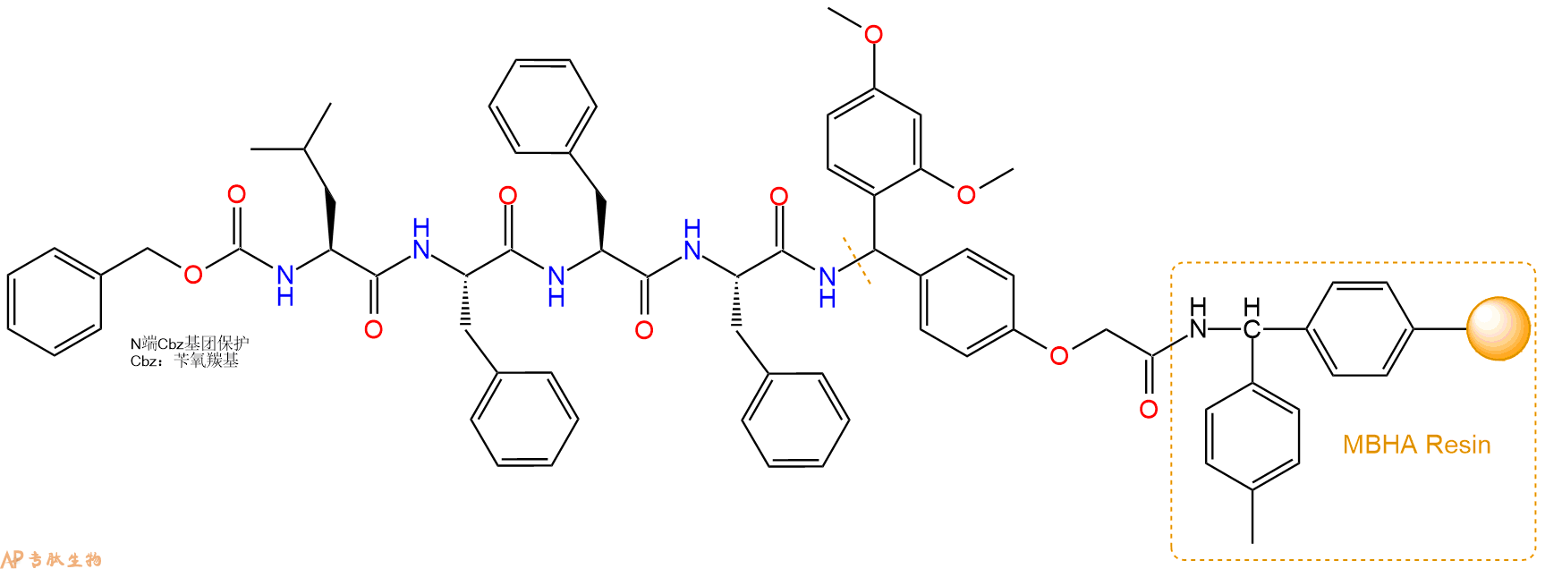 5、苯甲氧羰酰琥珀酰亚胺Cbz-Cl反应连接:在上述树脂中,加入适当DMF后,再加入2.61mmol苯甲氧羰酰琥珀酰亚胺Cbz-Cl到树脂中,再加入5.22mmol DIPEA,鼓氮气反应30分钟。用2倍树脂体积的DMF 洗涤3次树脂(洗涤树脂,去掉残留溶剂,为下一步反应做准备)。 得到Cbz-Leu-Phe-Phe-Phe-Linker-MBHAResin。 结构如下: