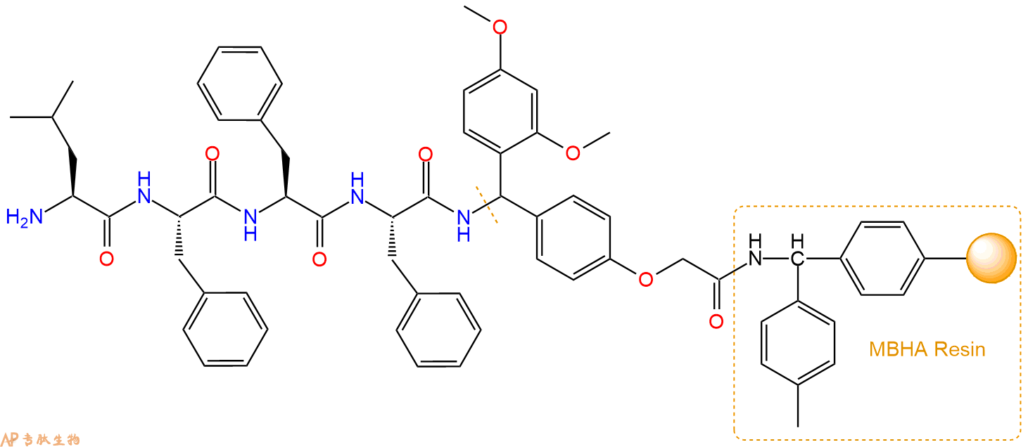 最后再经过步骤二得到 H2N-Leu-Phe-Phe-Phe-Linker-MBHA Resin,结构如下: