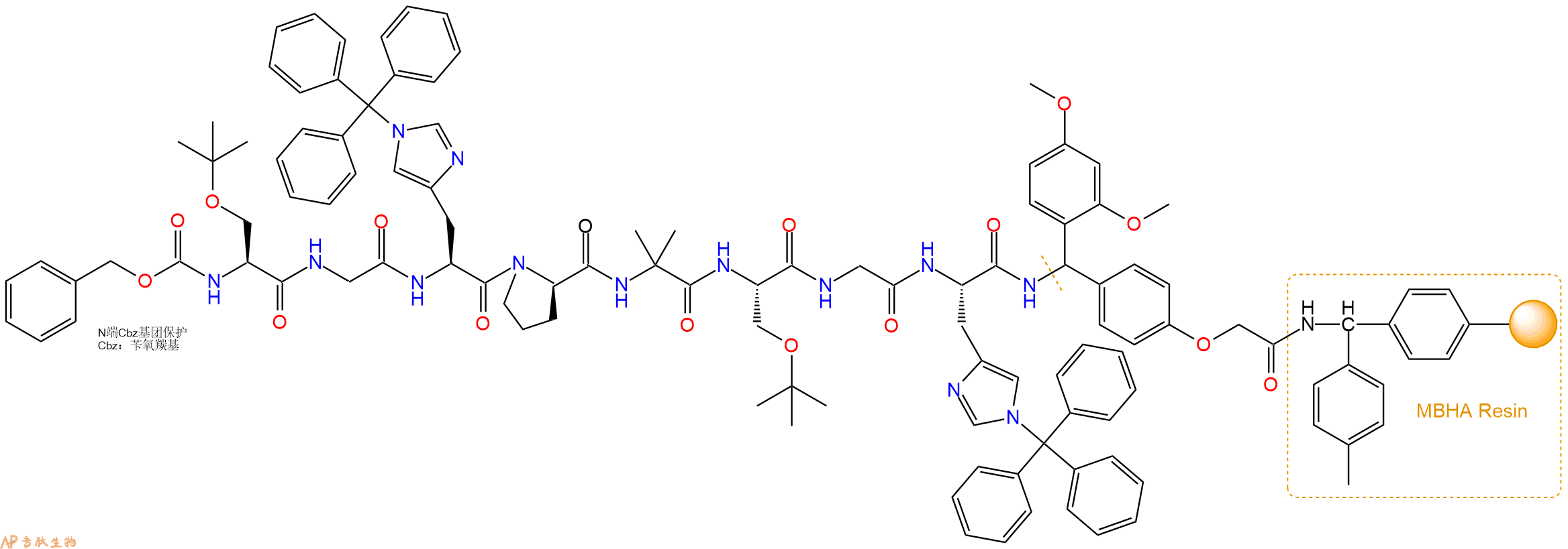 5、苯甲氧羰酰琥珀酰亚胺Cbz-Cl反应连接:在上述树脂中,加入适当DMF后,再加入1.03mmol苯甲氧羰酰琥珀酰亚胺Cbz-Cl到树脂中,再加入2.07mmol DIPEA,鼓氮气反应30分钟。用2倍树脂体积的DMF 洗涤3次树脂(洗涤树脂,去掉残留溶剂,为下一步反应做准备)。 得到Cbz-Ser(tBu)-Gly-His(Trt)-DPro-Aib-Ser(tBu)-Gly-His(Trt)-Linker-MBHAResin。 结构如下: