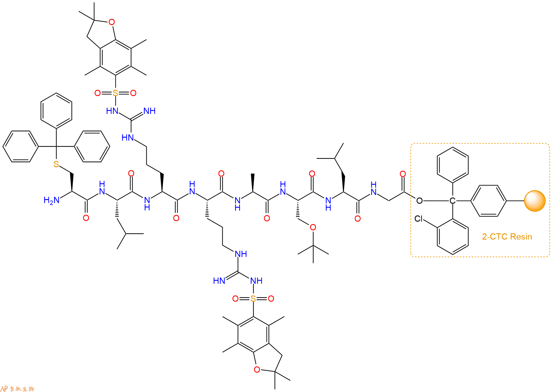 最后再经过步骤二得到 H2N-Cys(Trt)-Leu-Arg(Pbf)-Arg(Pbf)-Ala-Ser(tBu)-Leu-Gly-CTC Resin,结构如下: