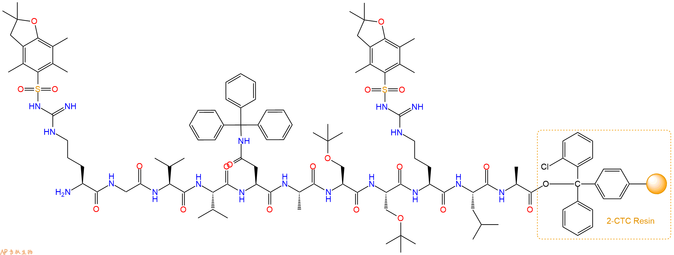 最后再经过步骤二得到 H2N-Arg(Pbf)-Gly-Val-Val-Asn(Trt)-Ala-Ser(tBu)-Ser(tBu)-Arg(Pbf)-Leu-Ala-CTC Resin,结构如下: