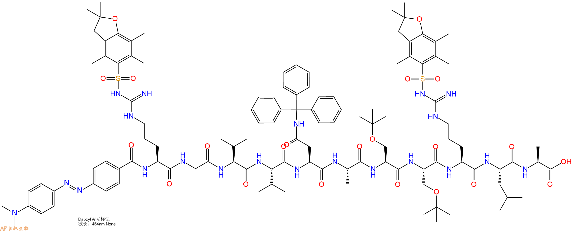 6、全保护切割:配置0.5%TFA/DCM溶液,溶液体积约为树脂体积的3倍。再次用DCM洗涤树脂2遍(去除残留DMF),后将配置好的溶液倒入到反应器中,反应30分钟。抽滤树脂,收集滤液(此时多肽已经从树脂上分离,存在于滤液中)。多肽序列为 DABCYL-Arg(Pbf)-Gly-Val-Val-Asn(Trt)-Ala-Ser(tBu)-Ser(tBu)-Arg(Pbf)-Leu-Ala-CTC Resin。 在滤液中添加DIEPA,调PH至7-8。用饱和NaHCO3洗涤滤液,分离出DCM层溶液。可适当旋蒸DCM层溶液,减少有机溶剂。再次加入1或2倍体积的乙酸乙酯,用稀HCl溶液调PH至微酸性,将多肽从DCM层萃取到乙酸乙酯层。用饱和NaCl洗涤2次乙酸乙酯层。用无水硫酸镁吸收乙酸乙酯层的水分。通过减压旋蒸,直接将乙酸乙酯完全旋蒸掉,得到晶体状固体多肽,用于下一步C端反应。或通过减压旋蒸保留适量乙酸乙酯的溶液体积,加入冰乙醚析出 多肽,然后对多肽进行烘干操作即可用于下一步C端反应。DABCYL-Arg(Pbf)-Gly-Val-Val-Asn(Trt)-Ala-Ser(tBu)-Ser(tBu)-Arg(Pbf)-Leu-Ala-COOH的结构图如下。