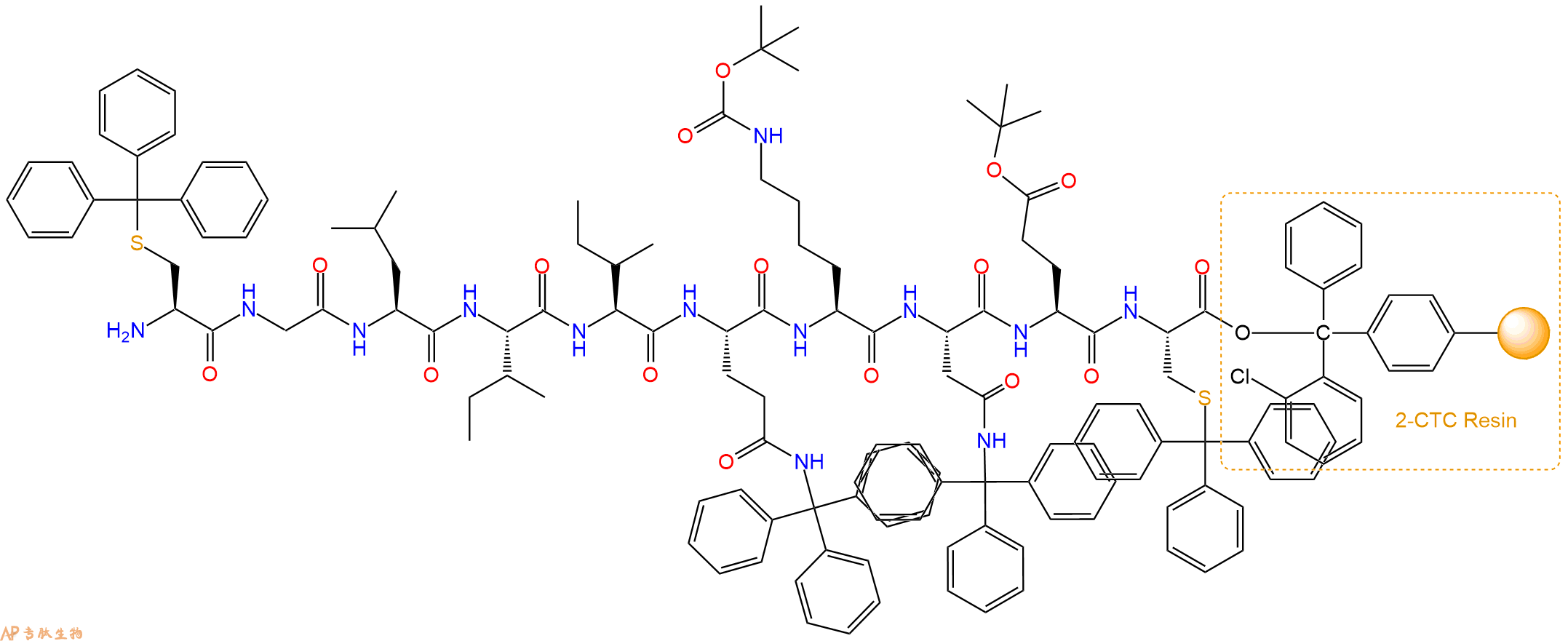 最后再经过步骤二得到 H2N-Cys(Trt)-Gly-Leu-Ile-Ile-Gln(Trt)-Lys(Boc)-Asn(Trt)-Glu(OtBu)-Cys(Trt)-CTC Resin,结构如下: