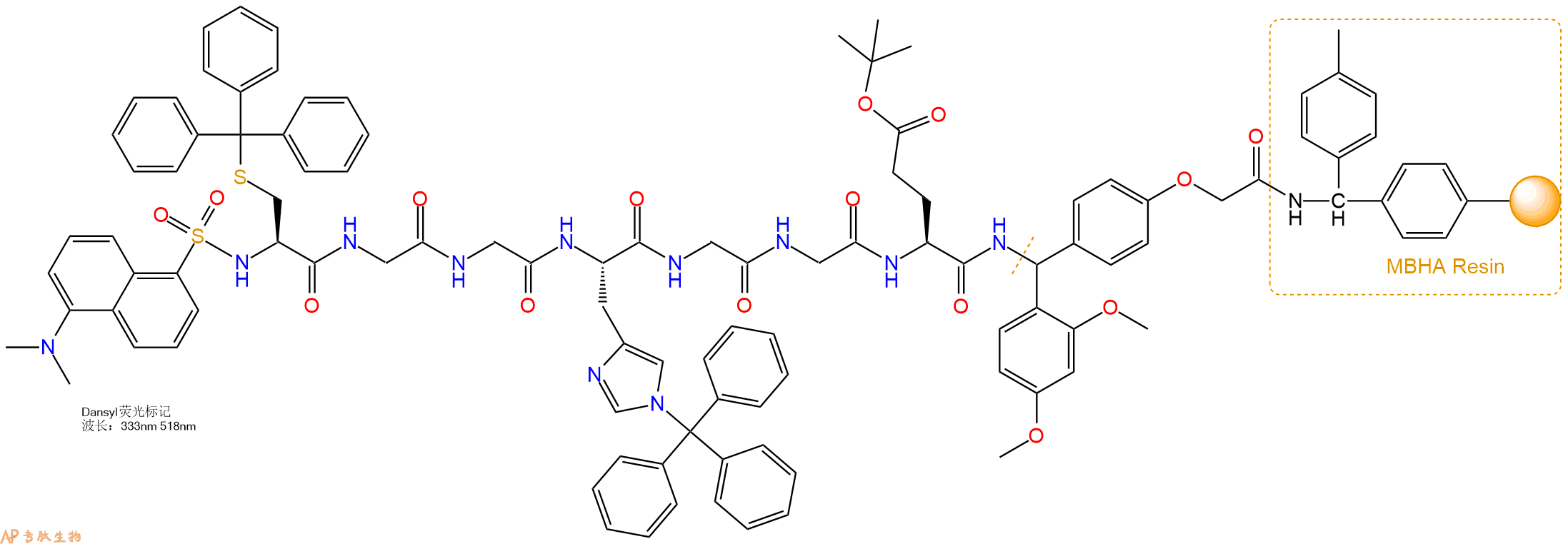 5、丹酰酸 Dansyl反应连接:在上述树脂中,加入适当DMF后,再加入1.51mmol 丹酰酸 Dansyl到树脂中,再加入3.02mmol DIPEA、1.44mmol HBTU,鼓氮气反应30分钟。用2倍树脂体积的DMF 洗涤3次树脂(洗涤树脂,去掉残留溶剂,为下一步反应做准备)。 得到Dansyl-Cys(Trt)-Gly-Gly-His(Trt)-Gly-Gly-Glu(OtBu)-Linker-MBHAResin。 结构如下: