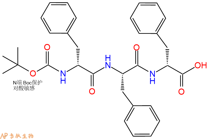 6、全保护切割:配置0.5%TFA/DCM溶液,溶液体积约为树脂体积的3倍。再次用DCM洗涤树脂2遍(去除残留DMF),后将配置好的溶液倒入到反应器中,反应30分钟。抽滤树脂,收集滤液(此时多肽已经从树脂上分离,存在于滤液中)。多肽序列为 Boc-DPhe-Phe-DPhe-CTC Resin。 在滤液中添加DIEPA,调PH至7-8。用饱和NaHCO3洗涤滤液,分离出DCM层溶液。可适当旋蒸DCM层溶液,减少有机溶剂。再次加入1或2倍体积的乙酸乙酯,用稀HCl溶液调PH至微酸性,将多肽从DCM层萃取到乙酸乙酯层。用饱和NaCl洗涤2次乙酸乙酯层。用无水硫酸镁吸收乙酸乙酯层的水分。通过减压旋蒸,直接将乙酸乙酯完全旋蒸掉,得到晶体状固体多肽,用于下一步C端反应。或通过减压旋蒸保留适量乙酸乙酯的溶液体积,加入冰乙醚析出 多肽,然后对多肽进行烘干操作即可用于下一步C端反应。Boc-DPhe-Phe-DPhe-COOH的结构图如下。