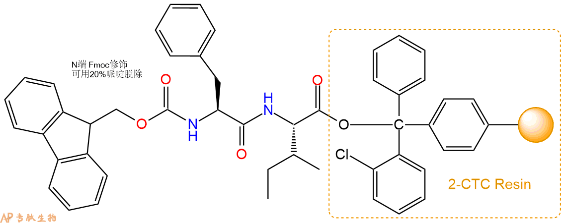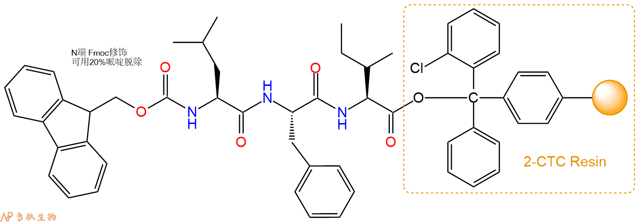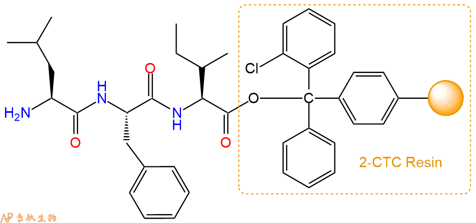 最后再经过步骤二得到 H2N-Leu-Phe-Ile-CTC Resin,结构如下: