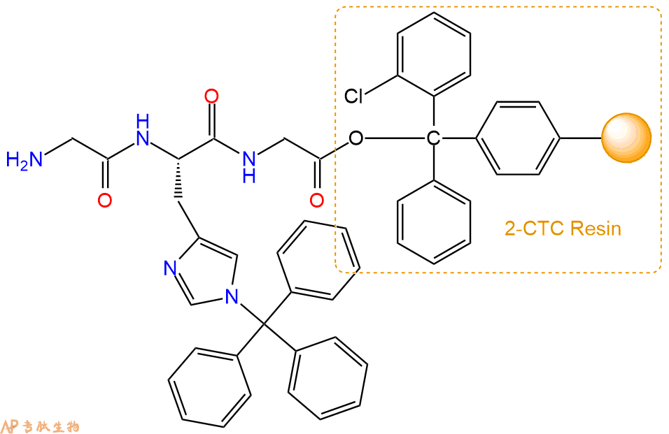 最后再经过步骤二得到 H2N-Gly-His(Trt)-Gly-CTC Resin,结构如下: