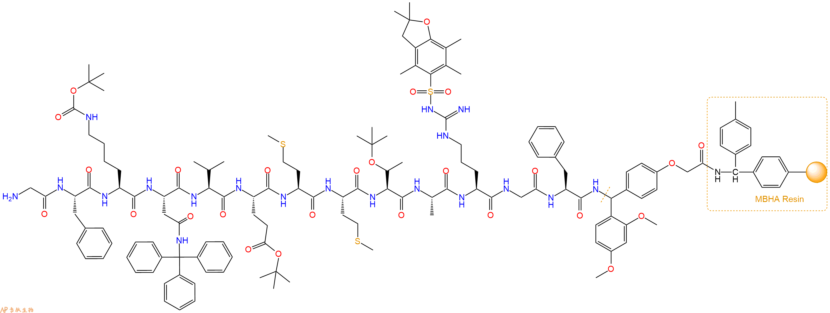 Fmoc-Gly-Phe-Lys(Boc)-Asn(Trt)-Val-Glu(OtBu)-Met-Met-Thr(tBu)-Ala-Arg(Pbf)-Gly-Phe-Linker-MBHA Resin